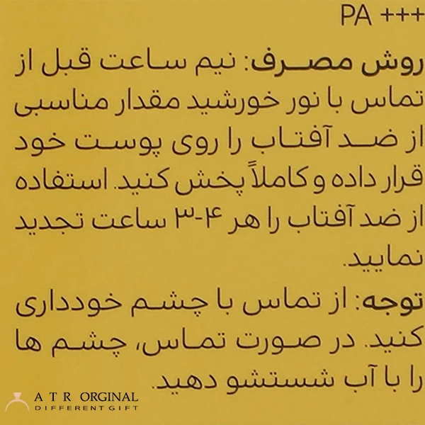- 30 دقیقه قبل از قرارگرفتن در معرض نورخورشید به اندازه کافی روی پوست تمیز و خشک خود بمالید تا خوب جذب شود و هر 3 الی 4 ساعت یکبار تمديد کنید.