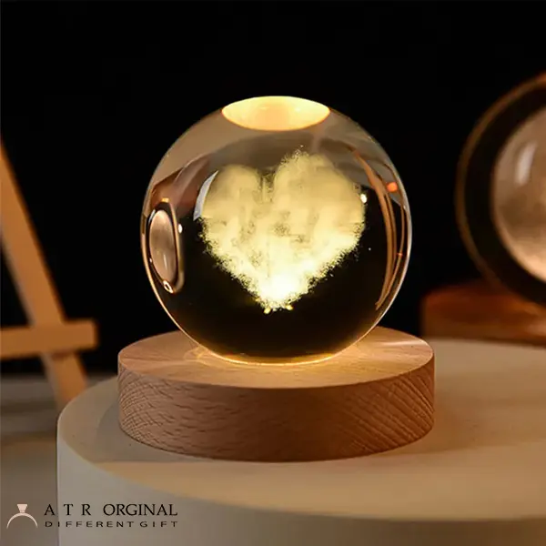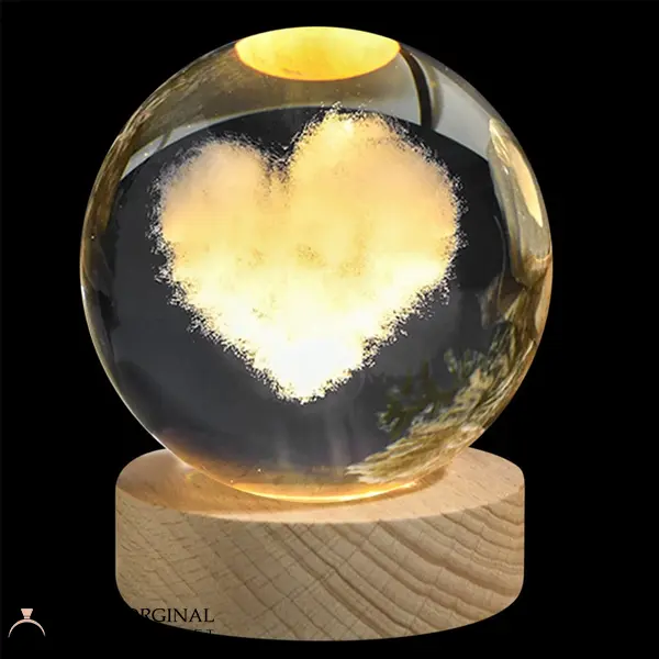 این چراغ خواب از یک گوی کریستالی به قطر 6 سانتی متر تشکیل شده که داخل آن طرح قلبی به صورت پنبه ای به زیبایی تمام و سه بعدی ترسیم شده و زمانی که بر روی پایه قرار می گیرد از بخش زیرین آن نور تابیده می شود و بسیار زیبا می درخشد و تصویر این قلب پنبه ای به صورت واضح دیده می شود. این طرح گوی کریستالی را می توانید به کسانی که دوستشان دارید هدیه دهید و آن ها را خوشحال کنید.