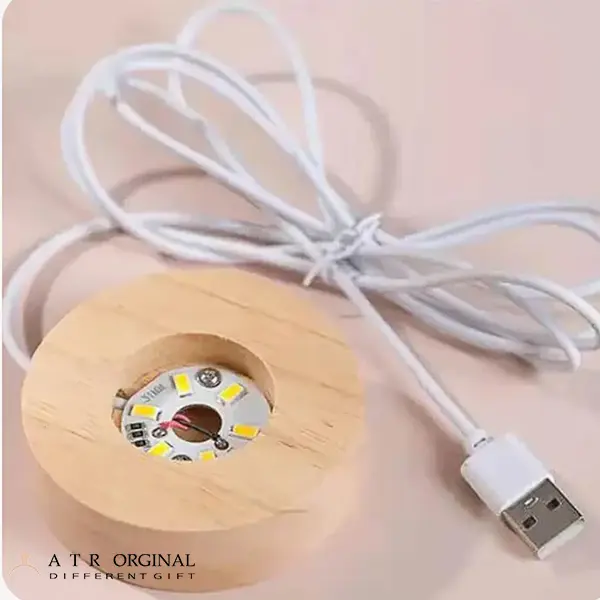 پایه ای که گوی کریستالی بر روی آن قرار می گیرد از جنس چوب می باشد و داخل پایه حفره ای طراحی شده که لامپ های ال ای دی بسیار کوچکی قرار گرفته و زمانی که پایه را به برق متصل می کنید لامپ های ال ای دی روشن می شود. ارتفاع گوی کریستالی به همراه پایه 8 سانتی متر است. منبع تغذیه این گوی کابل USB می باشد.