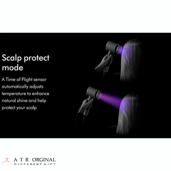 - حالت محافظت از پوست سر (Scalp Protect Mode): این ویژگی برجستهترین نوآوری این سشوار است. یک سنسور “زمان پرواز” (Time-of-Flight) با استفاده از پرتو مادون قرمز، فاصله سشوار تا پوست سر را اندازهگیری میکند. با نزدیک شدن سشوار به سر، به صورت خودکار دما را کاهش میدهد تا دمای مطلوب و ایمن ۵۵ درجه سانتیگراد حفظ شود. این کار از آسیب دیدن پوست سر بر اثر حرارت بیش از حد جلوگیری کرده و باعث میشود موها از ریشه سالم و درخشان بمانند.