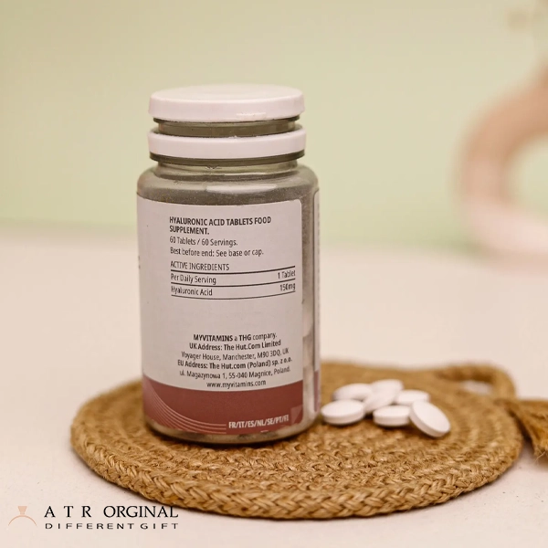 - قرص هیالورونیک اسید مای ویتامینز با جذب و نگهداری آب در لایههای پوست، به افزایش رطوبت و شادابی آن کمک میکند.