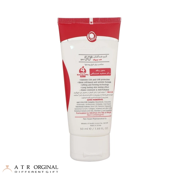 این کرم با SPF50 با استفاده از فرمولی پیشرفته، از پوست در برابر اشعههای UVB و UVA، پیری و چروک و آسیبهای ناشی از نور خورشید بر پوست محافظت میکند.